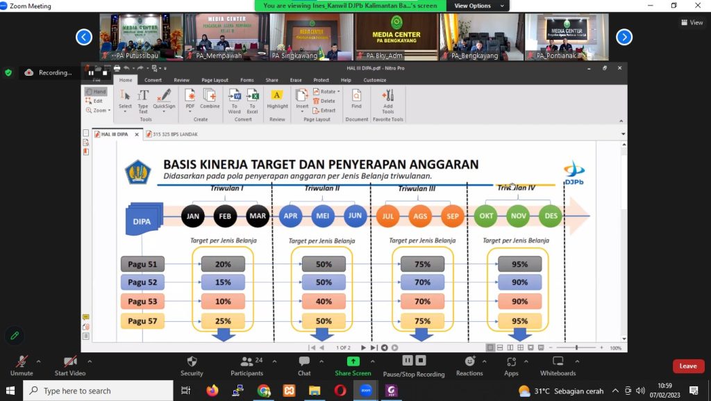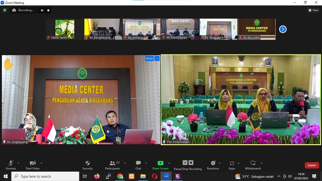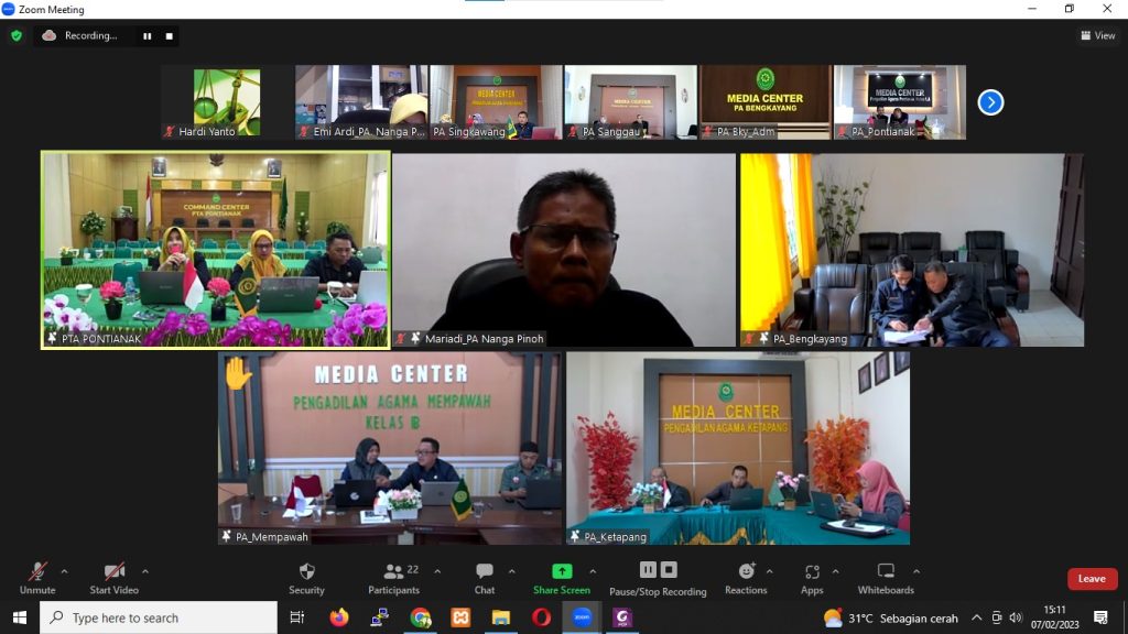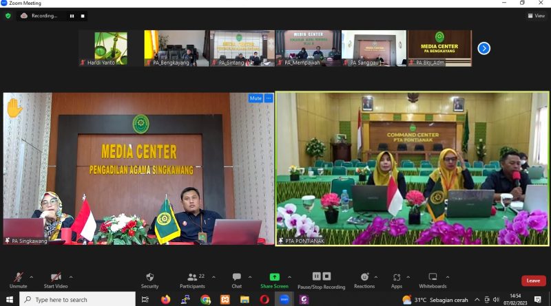 Selasa (7/2/2023), dilaksanakan Rapat Koordinasi Bagian Perencanaan dan Kepegawaian Pengadilan Tinggi Agama Pontianak dan Pengadilan Agama se-Kalimantan Barat. Hadir dalam acara tersebut Hakim Tinggi, Plt. Sekretaris, Kepala Bagian Perencanaan dan Kepegawaian, Kasubbag. Rencana Program dan Anggaran, Tim Penyusun LKjIP dan Tim Reviu LKjIP PTA Pontianak, serta Panitera, Sekretaris, Kasubbag PTIP, Kasubbag Keuangan, PPK, dan Tim Penyusunan Dokumen SAKIP Pengadilan Agama se-Kalimantan Barat.