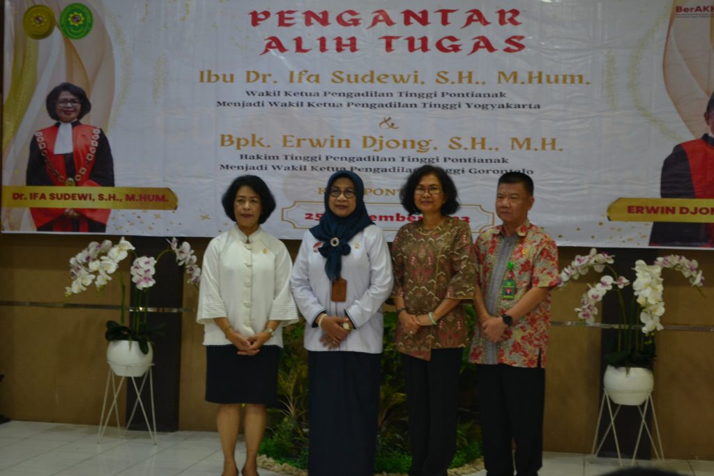 Adapun Wakil Ketua PT Pontianak, Ibu Ifa Sudewi, S.H., M.Hum. akan dilantik menjadi Wakil Ketua Pengadilan Tinggi Yogyakarta. Dan Pak Erwin Djong, S.H., M.H. selaku Hakim Utama Muda Pengadilan Tinggi Pontianak akan dilantik menjadi Wakil Ketua Pengadilan Tinggi Gorontalo.