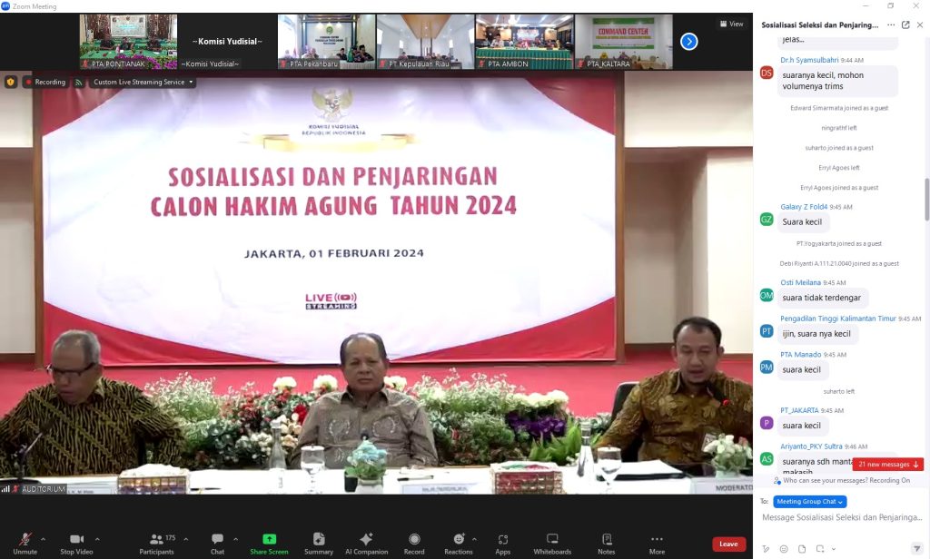 (31/01/2024) – Komisi Yudisial Republik Indonesia pada pagi ini, kamis (1/2), menggelar Sosialisasi dan Penjaringan Calon Hakim Agung Tahun 2024 secara daring yang diikuti oleh Plh. Ketua dan Hakim Tinggi PTA Pontianak serta Kasubbag Kepegawaian dan TI secara daring. Hal ini sebagai bentuk keterbukaan dalam proses rekrutmen Hakim Agung Mahkamah Agung Republik Indonesia.