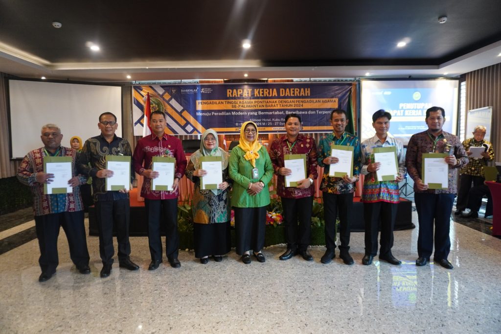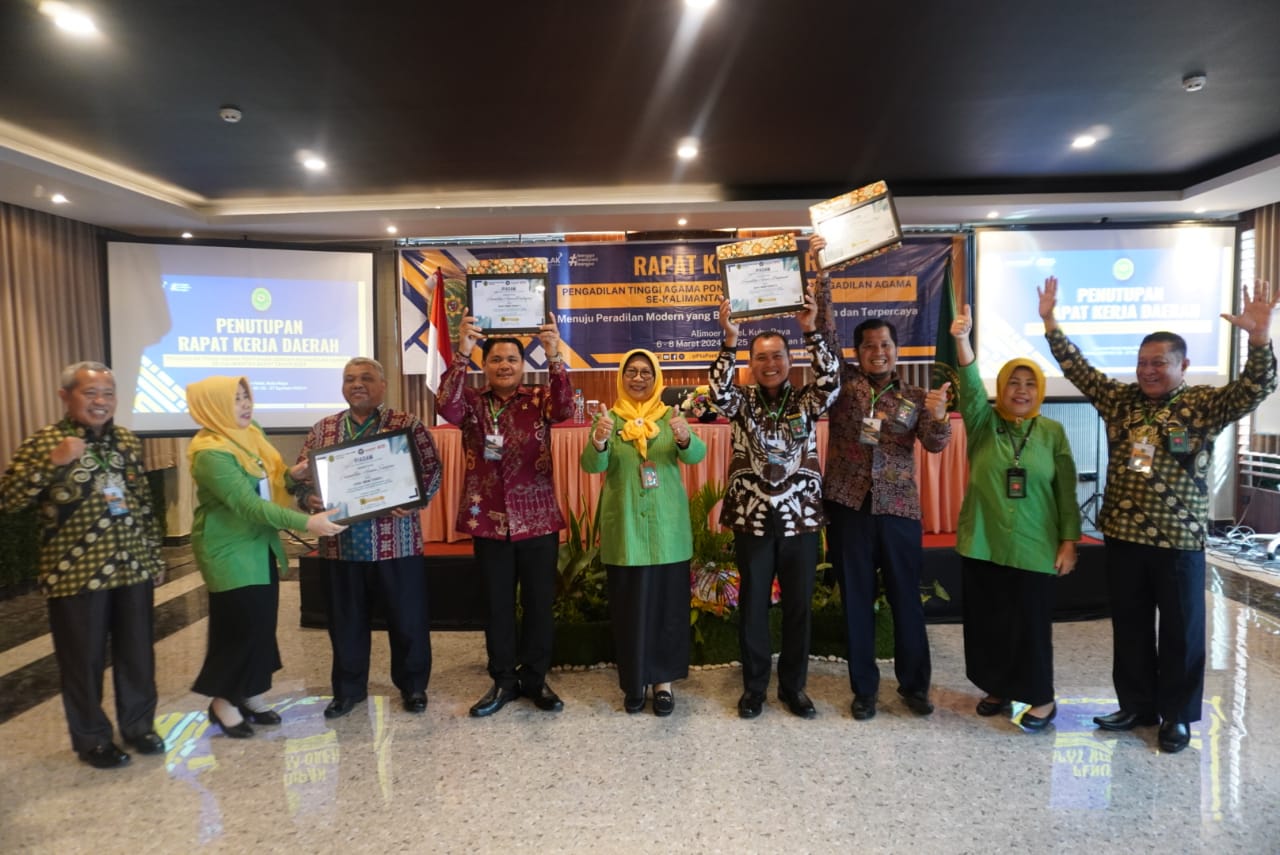 Hotel Alimoer, Sungai Raya (08/03/2024) – Rakerda PTA Pontianak yang telah berlangsung selama 3 hari ini, ditutup dengan penyerahan penghargaan kepada Pengadilan Agama di wilayah hukum PTA Pontianak dengan kinerja terbaik di tahun 2023. Surat Keputusan Tentang Penetapan Penerimaan Penghargaan Kinerja Terbaik Pengadilan Agama se-wilayah PTA Pontianak dibacakan oleh Hardiyanto, S.Kom. Adalah PA Sanggau Kelas II yang meraih Juara 1 pada kesempatan ini, dan Ketua PA Sanggau menerima piagam penghargaan tersebut yang diserahkan langsung oleh Ketua PTA Pontianak. Untuk Juara II diraih oleh Pengadilan Agama Bengkayang Kelas II. Dua Pengadilan Agama menerima Juara 3 Bersama yaitu Pengadilan Agama Mempawah Kelas IB dan Pengadilan Agama Sungai Raya Kelas II.