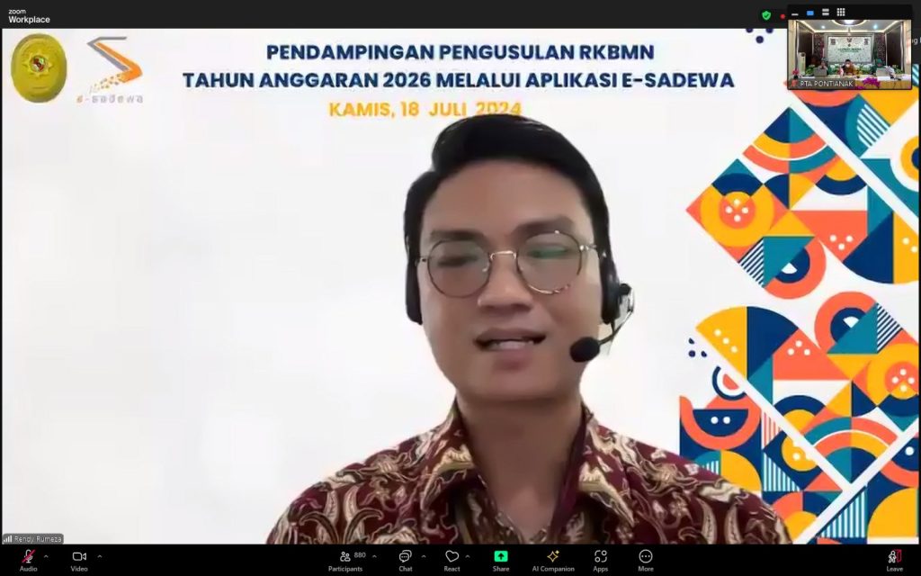 (18/7/2024) – Bertempat di Command Center, Sekretaris, Kabag Umum dan Keuangan serta Kasubag Keuangan dan Pelaporan PTA Pontianak mengikuti Pendampingan Pengusulan Rencana Kebutuhan Barang Milik Negara (RKBMN) Tahun Anggaran 2026 Melalui Aplikasi e-Sadewa.