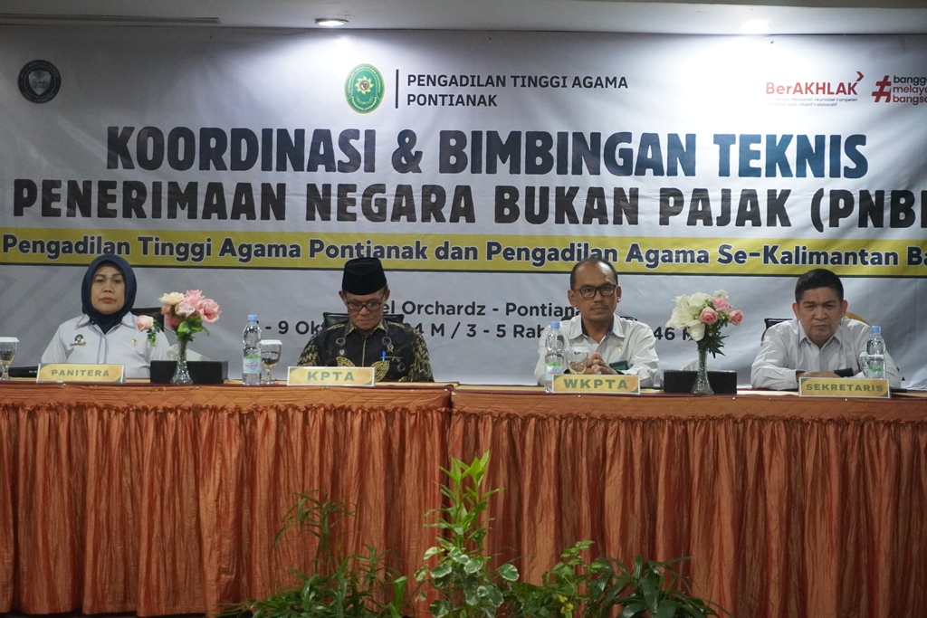(7/10/2024) – Ketua Pengadilan Tinggi Agama (PTA) Pontianak, Dr. Drs. H. Firdaus Muhammad Arwan S.H., M.H., secara resmi membuka Bimbingan Teknis (Bimtek) mengenai Penerimaan Negara Bukan Pajak (PNBP) untuk Panitera, Sekretaris, dan Bendahara pengadilan agama se-Kalimantan Barat.Acara tersebut berlangsung di Hotel Orchardz Ayani, selama 3 hari mulai dari tanggal 7 sd 9 Oktober 2024.
