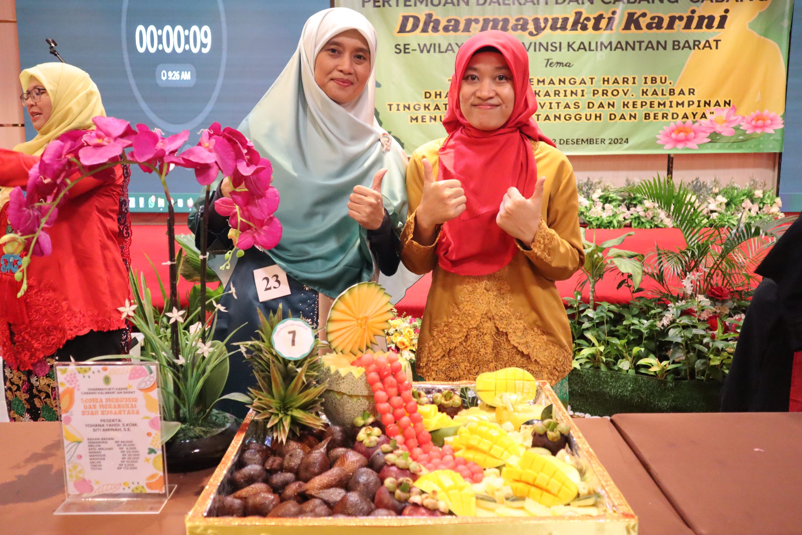 (12/12/2024) – Dua srikandi dari Pengadilan Tinggi Agama (PTA) Pontianak, Yohana Yahdi, S.Kom. dan Siti Aminah, S.E., berhasil meraih Juara 1 dalam lomba Mengukir dan Merangkai Buah pada acara Pertemuan Daerah dan Cabang-cabang Dharmayukti Karini (DYK) se-Provinsi Kalimantan Barat yang digelar pada Kamis, 12 Desember 2024, di Hotel Alimoer, Pontianak.
