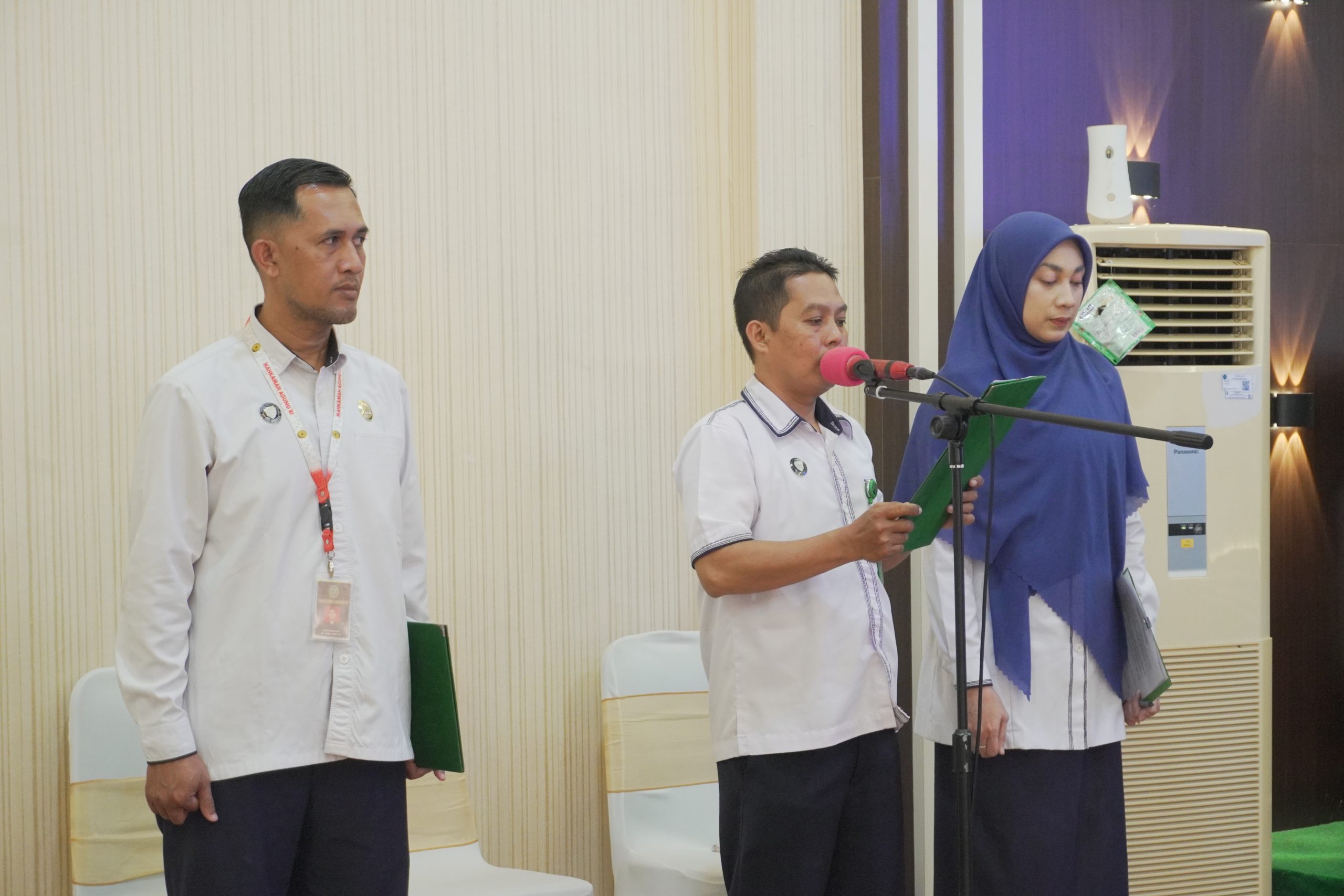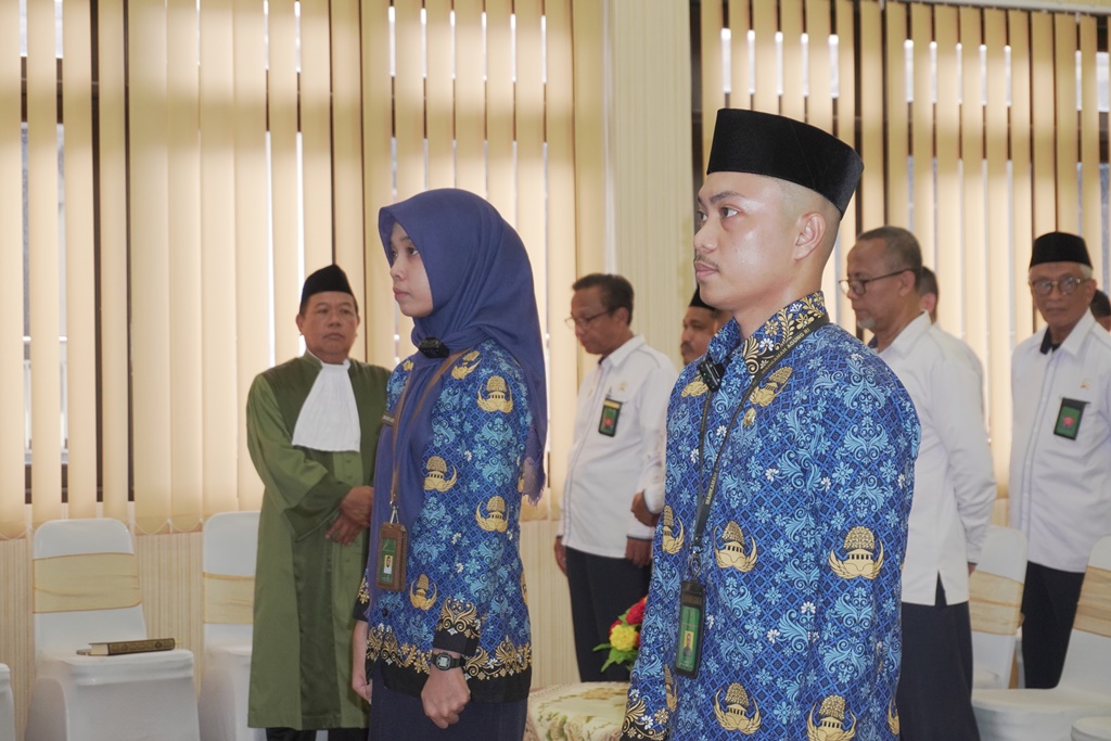 Acara diawali dengan pembukaan oleh pembawa acara, Syanurilia S., S.E. Suasana semakin khusyuk ketika doa bersama dipanjatkan oleh Suriadi, S.H.I., memohon agar para pegawai yang disumpah senantiasa diberi kekuatan, amanah, dan tanggung jawab dalam menjalankan tugas negara. Denny Firmansyah, S.E. bertugas sebagai ajudan, sementara Utami Linggar Sawesti, A.Md. memimpin lagu kebangsaan dan lagu hymne Mahkamah Agung sebagai bentuk penghormatan terhadap nilai-nilai luhur institusi peradilan. Dilanjutkan dengan pembacaan Surat Keputusan (SK) oleh Hardiyanto, S.Kom. Sumpah jabatan kemudian diucapkan secara khidmat oleh Roman dan Linda di hadapan Wakil Ketua selaku pejabat yang berwenang, dengan didampingi dua orang saksi, Muhammad Syafei, S.Ag. dan Renny Susanti, S.Ag. Hadir pula rohaniwan, Abang Muhammad Hasbi, S.H., yang memimpin pengucapan sumpah sesuai keyakinan, yakni Islam.