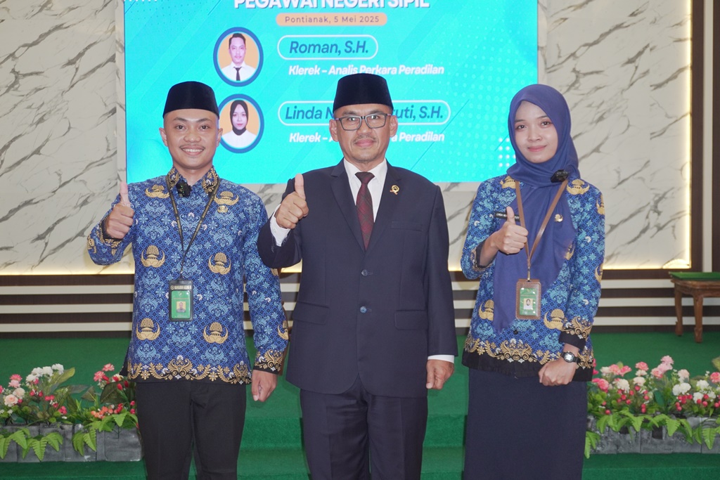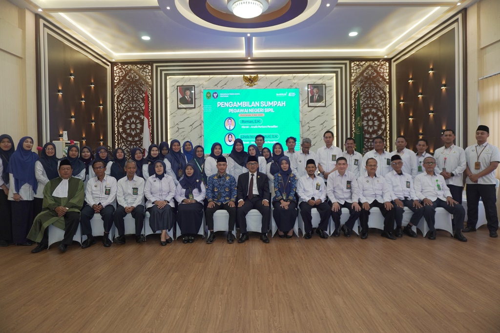 Pengadilan Tinggi Agama Pontianak melaksanakan prosesi pengambilan sumpah Pegawai Negeri Sipil (PNS) atas nama dua aparatur: Roman, S.H. dan Linda Novita Astuti, S.H. Kegiatan yang berlangsung di Aula PTA Pontianak ini dipimpin langsung oleh Wakil Ketua Pengadilan Tinggi Agama Pontianak, serta dihadiri oleh para Hakim Tinggi, pejabat struktural, fungsional, dan pegawai di lingkungan PTA Pontianak.