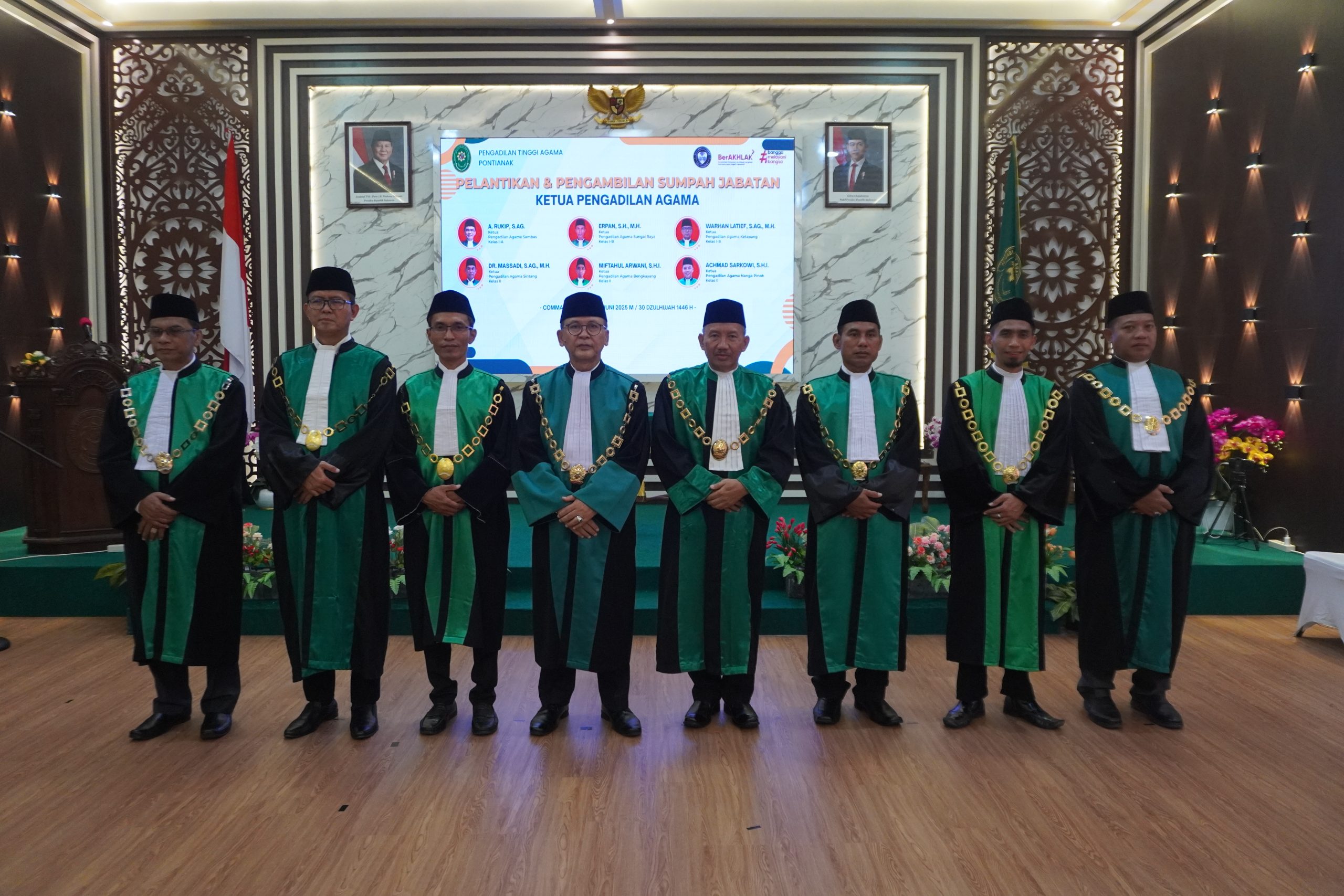 Kamis, 26 Juni 2025, Pengadilan Tinggi Agama Pontianak melaksanakan Pelantikan dan Pengambilan Sumpah Jabatan Wakil Ketua Pengadilan Tinggi Agama Pontianak, serta enam ketua pengadilan tingkat pertama di wilayah Pengadilan Tinggi Agama Pontianak.
