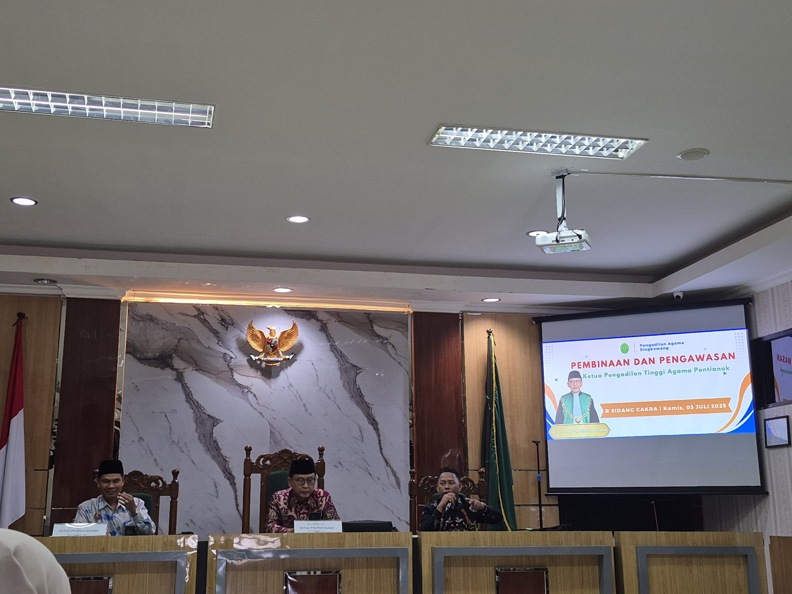 Singkawang, 3 Juli 2025 — Setelah melakukan pembinaan di PA Sambas pada pagi hari, Ketua Pengadilan Tinggi Agama (PTA) Pontianak melanjutkan agenda kunjungan kerjanya ke Pengadilan Agama (PA) Singkawang pada pukul 14.00 WIB, pada Kamis, 3 Juli 2025.