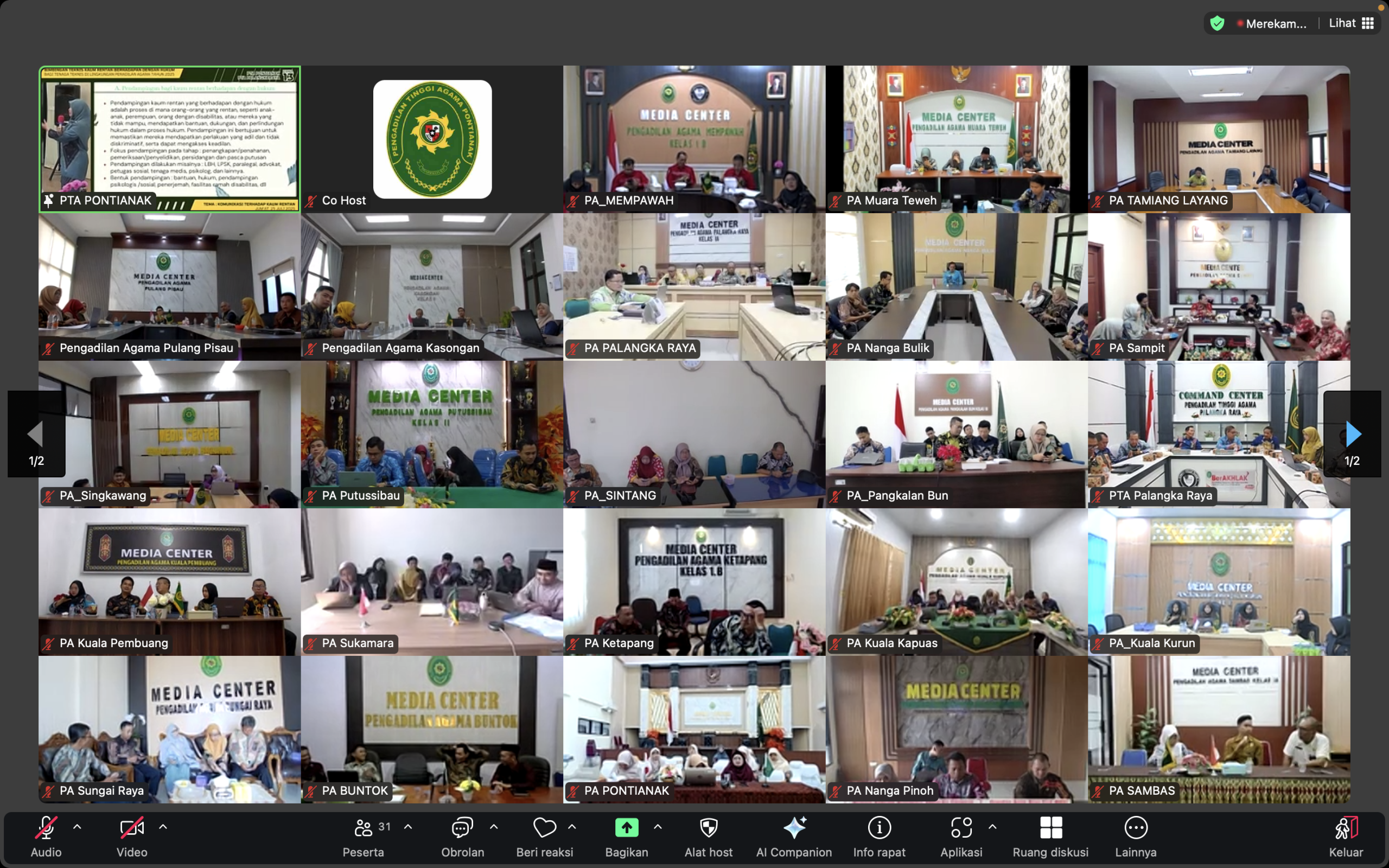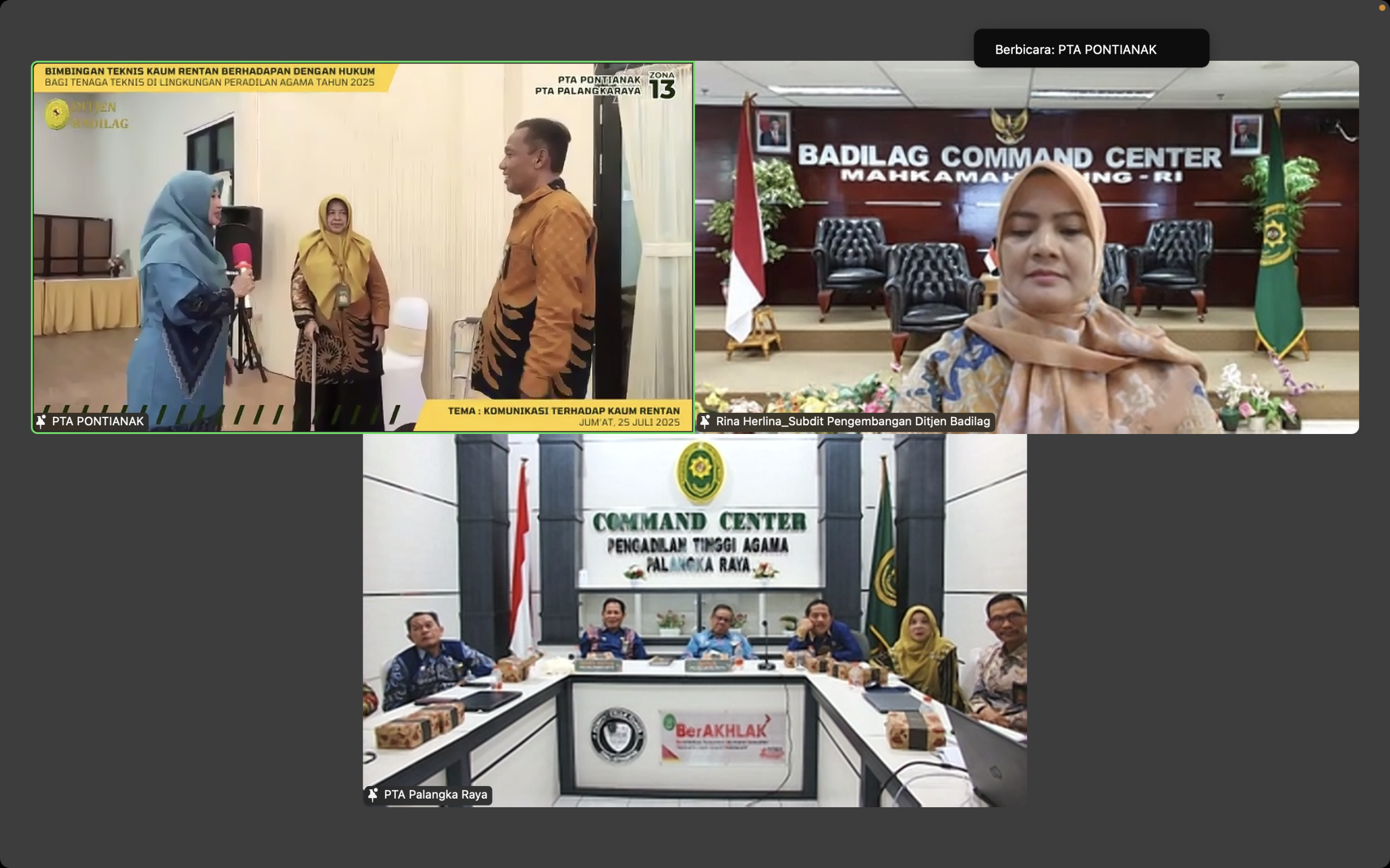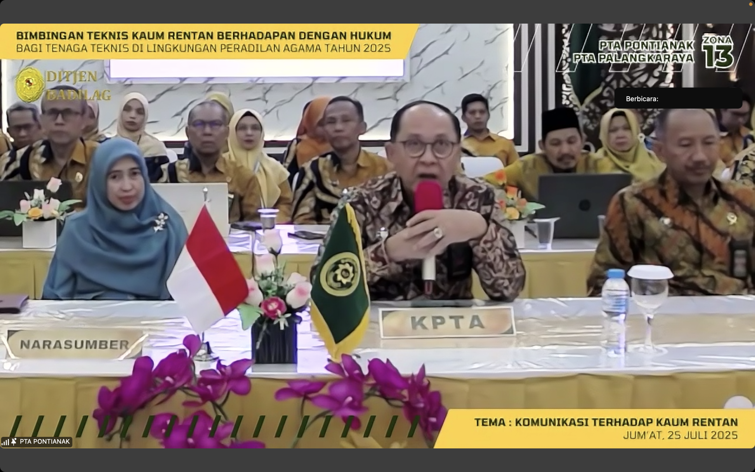 Pontianak, 25 Juli 2025 – Pengadilan Tinggi Agama (PTA) Pontianak sukses menjadi tuan rumah kegiatan Bimbingan Teknis (Bimtek) Komunikasi Terhadap Kaum Rentan Berhadapan dengan Hukum untuk wilayah Zona 13 yang meliputi PTA Pontianak dan PTA Palangkaraya. Kegiatan ini diikuti oleh 26 satuan kerja dari seluruh wilayah hukum dua PTA tersebut, dan diselenggarakan secara hybrid (daring dan luring).