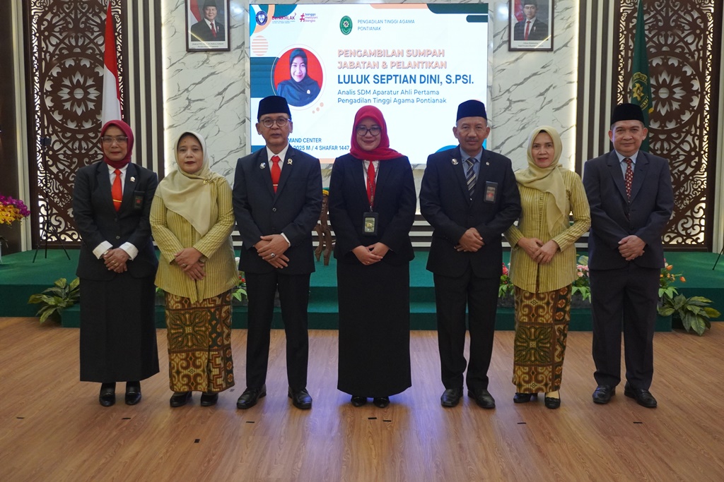 (Selasa, 29 Juli 2025) – Ketua Pengadilan Tinggi Agama (PTA) Pontianak, Dr. Drs. H. Moch. Sukkri, S.H., M.H., melantik sembilan pejabat baru di lingkungan PTA Pontianak. Prosesi pelantikan berlangsung di Aula PTA Pontianak mulai pukul 09.00 WIB hingga selesai, dengan format hybrid: disaksikan langsung oleh jajaran internal serta secara daring oleh satuan kerja di bawah wilayah hukum PTA Pontianak.