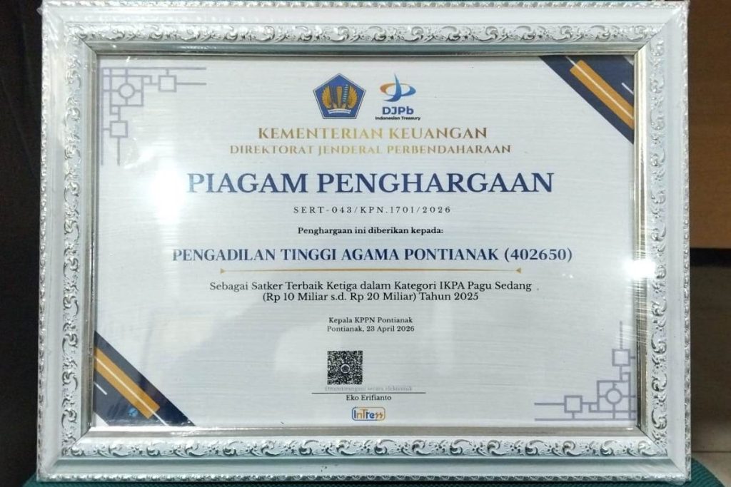 Penghargaan ini menjadi bentuk apresiasi atas kinerja PTA Pontianak dalam pengelolaan keuangan negara.