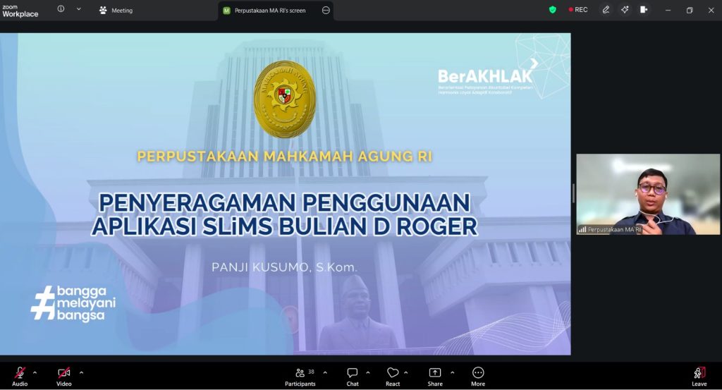 Selanjutnya, Panji Kusumo, S.Kom., Pranata Komputer Ahli Pertama pada BUA Mahkamah Agung RI, memaparkan standardisasi penggunaan aplikasi SLiMS Bulian G Roger, termasuk pengenalan sistem dan praktik penggunaannya.